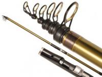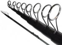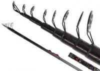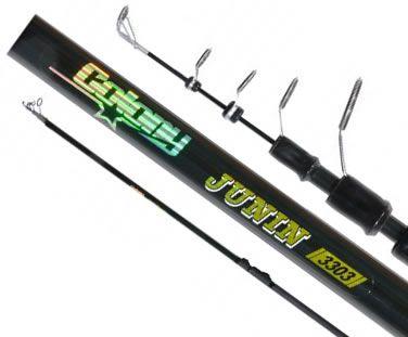 Con 8 secciones y 4 mts de largo. Grafito. Con 6 pasahilos. Plomada 20-40 grs. Portareel a cremallera.