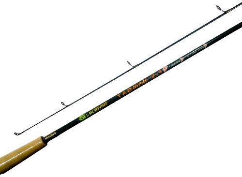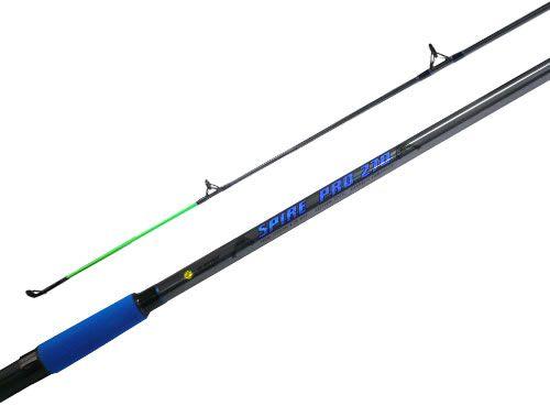 Con 2 tramos y 2,10 mts de largo. Composición grafito. Con 6 pasahilos de 1 pata en óxido. Acción de punta. Mango en goma eva con portareel.