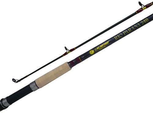 Con 2 tramos y 2,40 mts de largo. Composición grafito. Con 6 pasahilos reforzados. Puntera en óxido de aluminio. Empuñadura en eva. Color negra. Acción media pesada. Portareel gatillo combinado en ABS y metal.