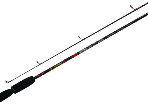 Con 2 tramos y 2,10 mts de largo. Composición grafito. Con 6 pasahilos reforzados. Puntera en óxido de aluminio. Empuñadura en eva. Color negra. Acción media pesada. Portareel gatillo combinado en ABS y metal.