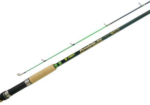 Con 2 tramos y 3 mts de largo. Composición grafito. Con 5 a 6 pasahilos reforzados. Puntera en óxido de aluminio siliconados. Acción media. Grip en corcho. Portareel combinado en plástico ABS y metal.