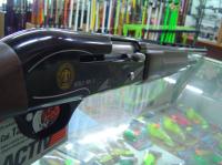Calibre 12. Escopeta a trombón. Largo del cañón de 28" y caño adicional estriado de 20" con banda ventilada. Culata de madera.