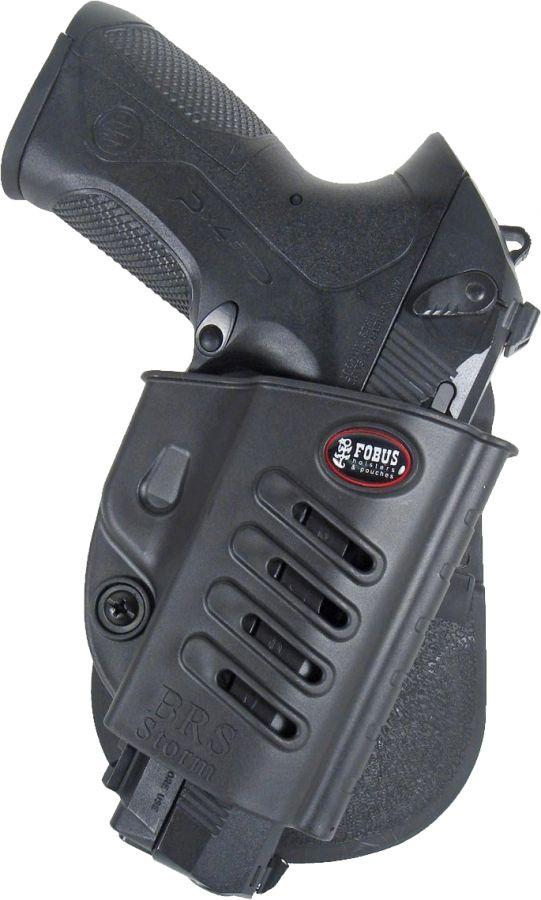 Funda rígida, molde inyectado con polímero RX18. El sistema Fobus de retención pasiva permite un desenfeunde instintivo y rápido. El mecanismo sujeta firmemente en el área del arco guardamonte, afirmando el arma en su lugar con mayor precisión de retenición según preferencia gracias al tornillo de ajuste personal. Modelo rotativo (Rotative) compatible con pistolas Beretta PX4 Storm Full Size & Compact / Taurus PT 845 / 24/7 / PT940 / PT840 / PT640 / PT100 / PT800 / PT809.