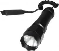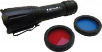 Cuerpo aluminio maquinado tipo III. Resistente al agua. Antishcok. Clip para cinturón. Potencia: 230 lumens. Led Cree 4W. Peso sin baterías 170 grs. Baterias tipo AAA. Incluye filtros color rojo y azul.